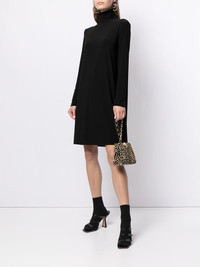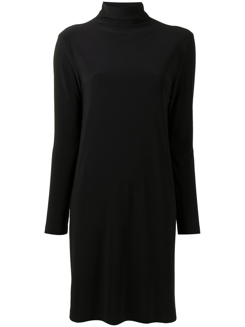 high neck jumper dress black cotton fine knit roll neck long sleeves shift style straight hem Made in United States Composition Cotton 100% SIZE & FIT Model measurements Height 5 ft 10 in(1.77 m) Bust/Chest 31.49 in(80 cm) Hips 34.64 in(88 cm) Waist 23.62 in(60 cm) FittingInformation This piece fits true to size. We recommend you get your regular size Cut for a loose fit Made with a mid-weight stretch fabric