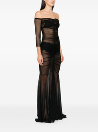 off-shoulder fishtail gown Highlights - Black - Mesh design - Semi-sheer construction - Off-shoulder - Fishtail train - Sweetheart neck - Off-shoulder - Three-quarter length sleeves - Fitted waistline - Unlined - Curved hem - Floor-length Imported Composition Nylon 82%, Spandex/Elastane 18% SIZE & FIT Model measurements Height 5 ft 11 in(1.8 m) Bust/Chest 33.07 in(84 cm) Hips 37.4 in(95 cm) Waist 25.19 in(64 cm) FittingInformation Designed for a slim fit that sits just away from the body offering a close yet comfortable fit Made from a midweight stretch fabric, this piece offers elasticity and flexibility when worn Washing instructions Machine Wash