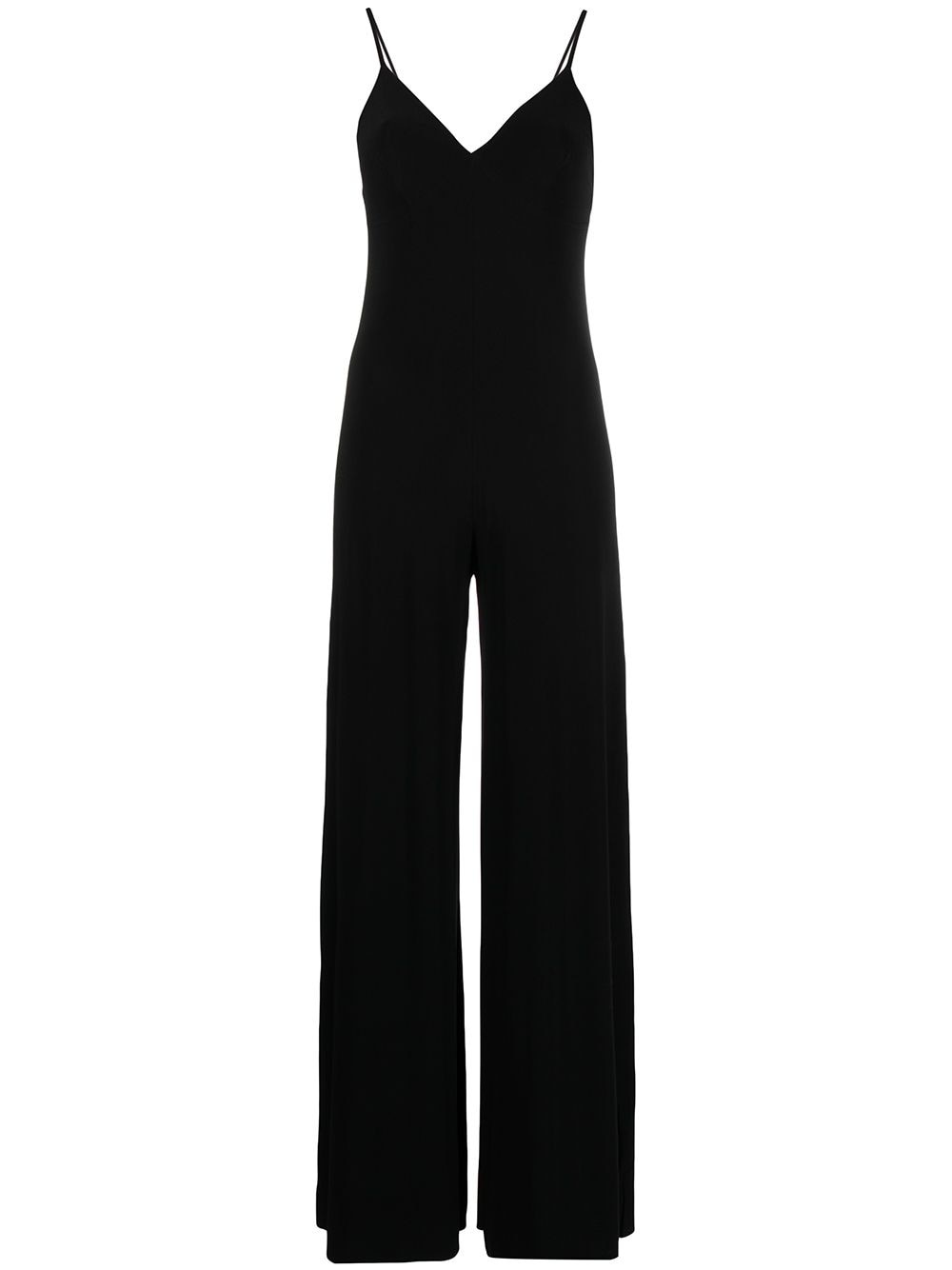 plunging V-neck jumpsuit black spaghetti straps sleeveless concealed side zip fastening wide leg Made in Italy Composition Polyester 95%, Spandex/Elastane 5% SIZE & FIT Model measurements Height 5 ft 9 in(1.74 m) Bust/Chest 32.28 in(82 cm) Hips 35.82 in(91 cm) Waist 24.01 in(61 cm) FittingInformation This piece fits true to size. We recommend you get your regular size Designed for a close fit at the bust, waist and hips Made with a mid-weight stretch fabric