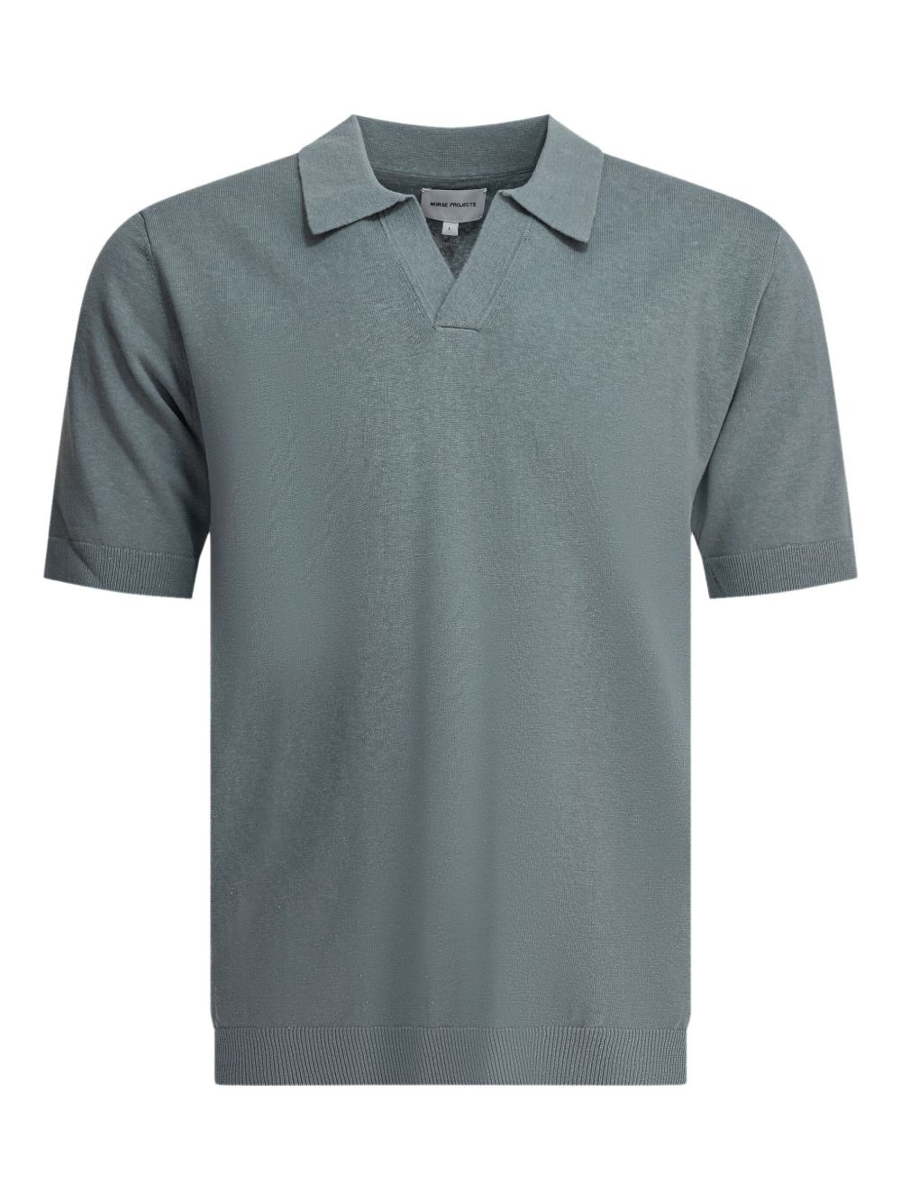 knitted V-neck T-shirt Highlights - Blue-green - V-neck - Short sleeves - Ribbed hem - Knitted texture - Polo collar Imported Composition Linen/Flax 55%, Cotton 45% Washing instructions Read Manufacturer Guidelines