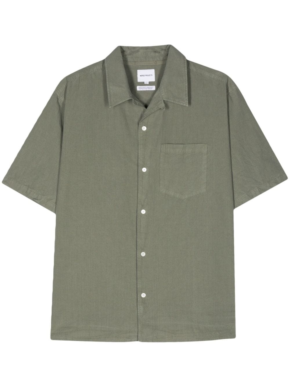 notch-collar short-sleeve shirt Highlights - Khaki - Cotton-lyocell blend - Notched collar - Front button fastening - Short sleeves - Chest patch pocket - Straight hem Imported Composition Lyocell 50%, Cotton 50% SIZE & FIT Measurement CHEST 47.24 in(120 cm) SLEEVE LENGTH 11.02 in(28 cm) LENGTH 27.95 in(71 cm) WAIST 45.66 in(116 cm) Shoulder Width 19.68 in(50 cm) Washing instructions Machine Wash