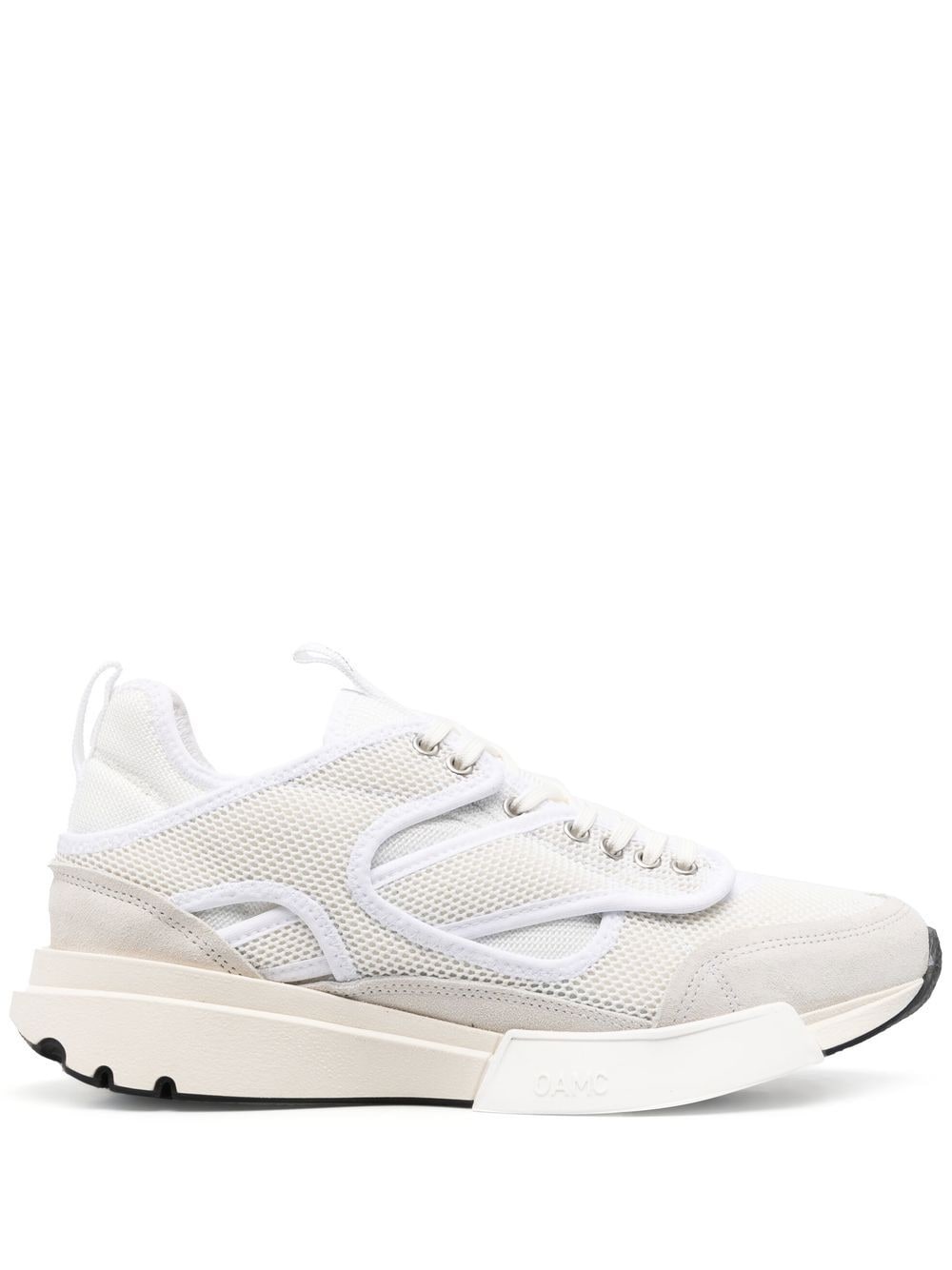 Aurora panelled low-top sneakers A running-inspired silhouette is imagined for urban life with these OAMC sneakers. The muted pair is crafted from suede and overlaid with mesh panels. Designed for comfort, it sits atop an Ortholite insole that is supported by a custom-made sole. Highlights - Cream white - Mesh panelling - Front lace-up fastening - Logo-print tongue - Panelled design - Contrasting trim - Double pull-tab at the opening - Branded insole - Rubber sole Imported Composition Outer: Calf Leather 100%, Fabric 100% Lining: Fabric 100% Sole: Rubber 100% SIZE & FIT Measurement HEEL 1.57 in(4 cm) Sole height 0.78 in(2 cm)