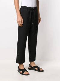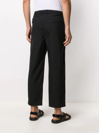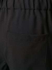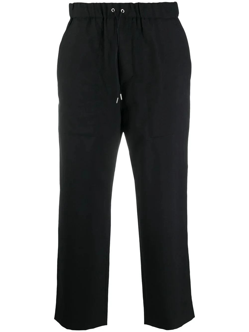 high-rise drawstring cropped trousers black virgin wool/cotton high-waisted drawstring fastening cropped leg loose fit elasticated waistband rear patch pocket Made in Italy Composition Lining: Cotton 100%, Cupro 100% Outer: Virgin Wool 100% SIZE & FIT Model measurements Height 6 ft 1 in(1.85 m) Bust/Chest 35.82 in(91 cm) Hips 37.79 in(96 cm) Waist 29.13 in(74 cm) FittingInformation This piece fits true to size. We recommend you get your regular size Regular fit Made with a mid-weight non-stretch fabric Washing instructions Machine Wash
