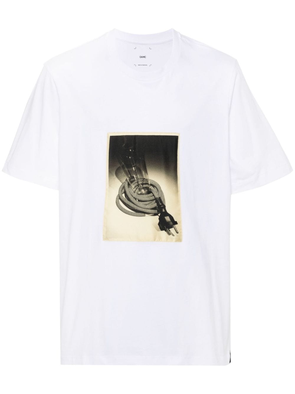 logo-print cotton T-shirt Highlights - White - Cotton - Jersey texture - Graphic print to the front - Logo print to the rear - Crew neck - Short sleeves - Straight hem Imported Composition Outer: Cotton 98%, Elastane 2% Cotton 100%, Silk 100% SIZE & FIT Model measurements Height 6 ft 0 in(1.84 m) Bust/Chest 35.82 in(91 cm) Hips 37 in(94 cm) Waist 28.34 in(72 cm) FittingInformation Designed for a relaxed fit, this piece allows for comfort and movement when worn Made from a midweight non-stretch fabric, this piece offers minimal elasticity when worn This piece fits true to size – take your usual size Washing instructions Hand Wash