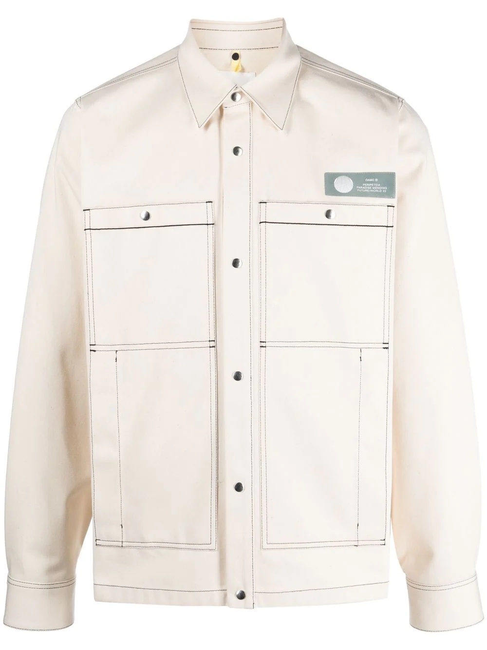 patch pocket shirt jacket cream white cotton contrast stitching silver-tone hardware pointed flat collar logo patch at the chest long sleeves two chest patch pockets two side slit pockets straight hem Made in Italy Composition Cotton 100% SIZE & FIT Model measurements Height 6 ft 1 in(1.85 m) Bust/Chest 35.82 in(91 cm) Hips 37.79 in(96 cm) Waist 29.13 in(74 cm) FittingInformation This piece fits true to size. We recommend you get your regular size Cut for a loose fit Made with a mid-weight non-stretch fabric Washing instructions Dry Clean Only