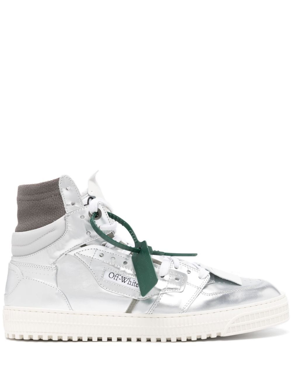 3.0 Off Court metallic sneakers Featuring signature elements of the Off-White brand, such as a Zip Tie tag and Arrows motif, these Off-Court 3.0 sneakers are instantly recognisable. The placement of these across the shoe and over a metallic colourway fits into the brand's concept of 'embracing the now in a sophisticated manner'. Highlights - Silver-tone - Calf leather - Metallic finish - Round toe - Front lace-up fastening - Signature zip tie tag - Signature arrows motif - Ridged rubber sole - Logo patch to the front - Due to the dyeing process used, this product must not come into contact with water. Made in Italy Composition Sole: Rubber 100% Outer: Leather 75%, Polyamide 20%, Polyester 4%, Elastane 1% Lining: Leather 50%, Polyester 43%, Elastane 7% SIZE & FIT Measurement CIRCUMFERENCE 9.84 in(25 cm) HEEL 1.37 in(3.5 cm) HEIGHT 5.31 in(13.5 cm) Sole height 0.98 in(2.5 cm)