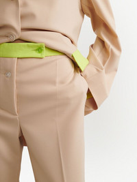 Active straight-leg tailored trousers Cut from a virgin wool blend, these Off-White trousers combine a classic tailored cut with the label's signature contemporary aeshtetic. The beige pair falls to a relaxed long length, and it features a contrasting waistband in fluorescent yellow. Highlights - Camel/fluorescent yellow - Virgin wool blend - High-waisted - Front button fastening - Pressed crease - Two side inset pockets - Two rear welt pockets - Straight leg Made in Italy Composition Outer: Polyester 53%, Virgin Wool 43%, Lyocell 4% Lining: Viscose 100%