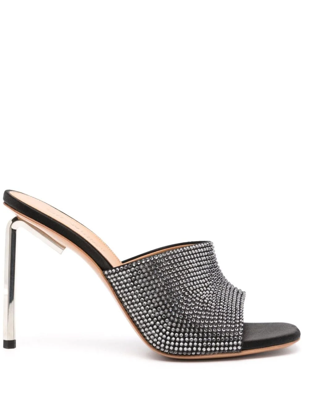 Allen crystal satin mules These Off-White sandals derive their name from their unique silver-tone metal heel, which resembles an Allen key. They’re crafted with a satin upper and feature striking, light-catching crystal embellishments across the wide front strap. Highlights - Black - Silk blend - Crystal embellishment - Satin finish - Open toe - Slip-on style - Branded insole - High heel Made in Italy Composition Silk 100% SIZE & FIT Measurement HEEL 4.33 in(11 cm)