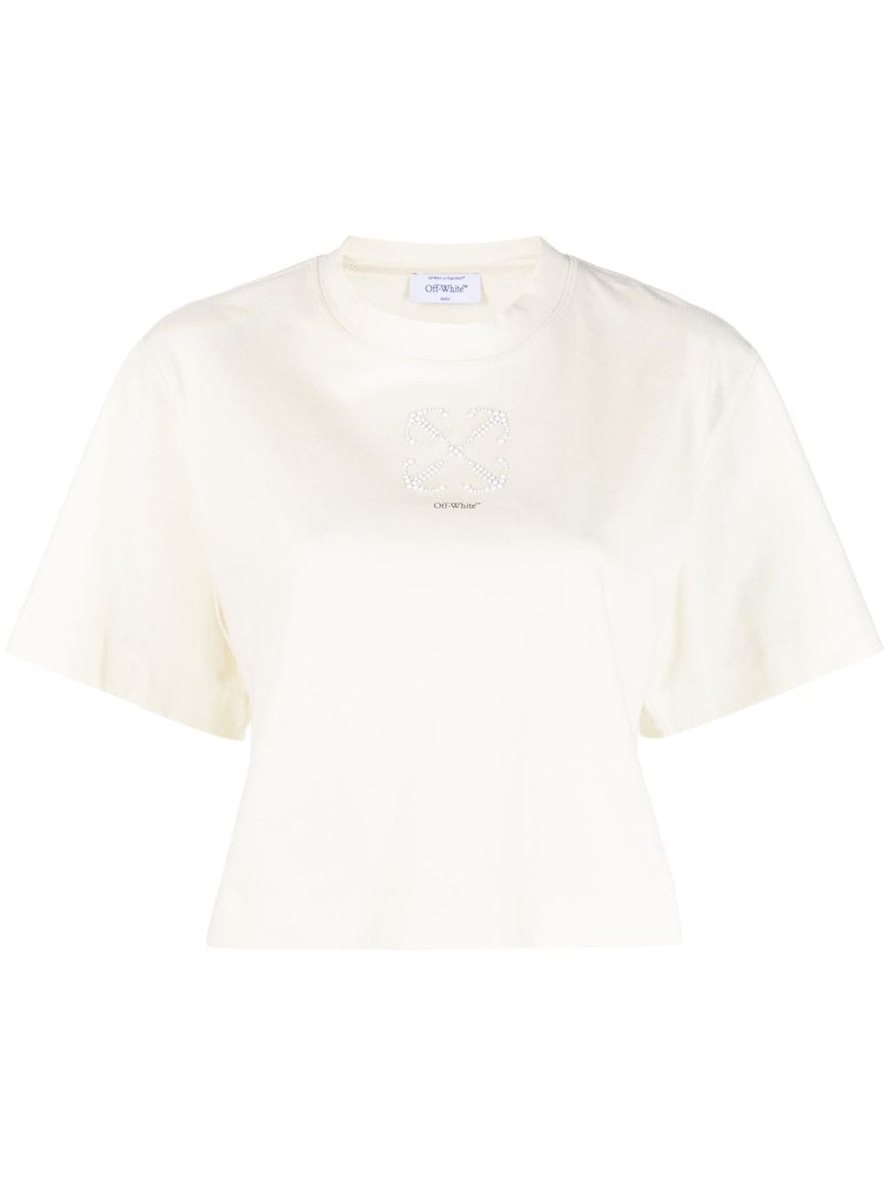 Arrows-motif embellished cropped T-shirt Off-White’s industrial-inspired Arrows motif is instantly recognisable. It decorates this ivory T-shirt, crafted from cotton to a cropped fit, in a pearlescent iteration. Highlights - Ivory white - Cotton - Faux-pearl embellishment - Signature arrows motif - Crew neck - Short sleeves - Straight hem - Cropped Imported Composition Cotton 100% SIZE & FIT Model measurements Height 5 ft 10 in(1.79 m) Bust/Chest 31.49 in(80 cm) Hips 35.03 in(89 cm) Waist 23.62 in(60 cm) FittingInformation Designed to be unstructured, offering a loose fit throughout Cropped in length Made from a midweight non-stretch fabric, this piece offers minimal elasticity when worn This piece fits true to size – take your usual size Washing instructions Machine Wash