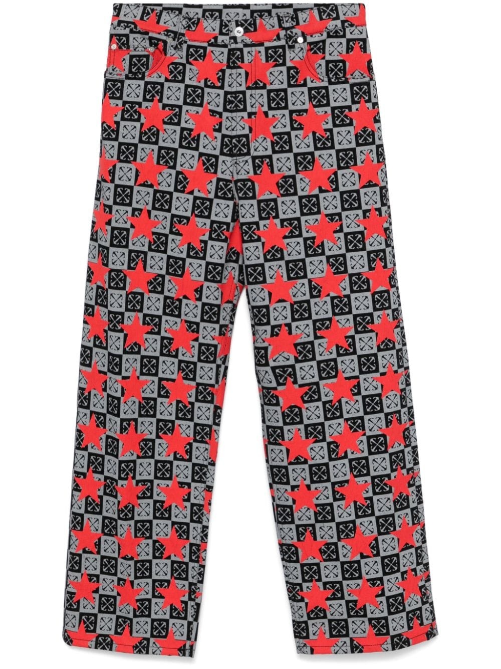 Arrows-print jeans Highlights - Black/grey/red - Cotton - Denim - Coated finish - Button fly fastening - Belt loops - Mid-rise - Signature arrows print - All-over star print - Classic five pockets - Logo patch to the rear - Straight leg Made in Italy Composition Outer: Cotton 100% Lining: Polyester 65%, Cotton 35% SIZE & FIT Model measurements Height 6 ft 2 in(1.87 m) Bust/Chest 35.03 in(89 cm) Hips 34.64 in(88 cm) Waist 25.98 in(66 cm) FittingInformation Designed with a wide leg, these jeans offer a loose and roomy fit Sturdy and hard-wearing, this denim piece offers no stretch