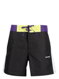 Arrows-print swim shorts Showcasing Off-White's preference for branded designs, these swim shorts display a logo print on one leg and the iconic Arrows motif at the back. They're cut with a colourblock waistband that secures with self-ties. Highlights - Black/purple - Signature arrows motif - Logo print at the hem - Front lace-up fastening - Rear patch pocket - Be mindful to try on swimwear over your own garments. Made in Italy Composition Lining: Polyester 100% Outer: S.Cafe® Polyester 100% Washing instructions Machine Wash