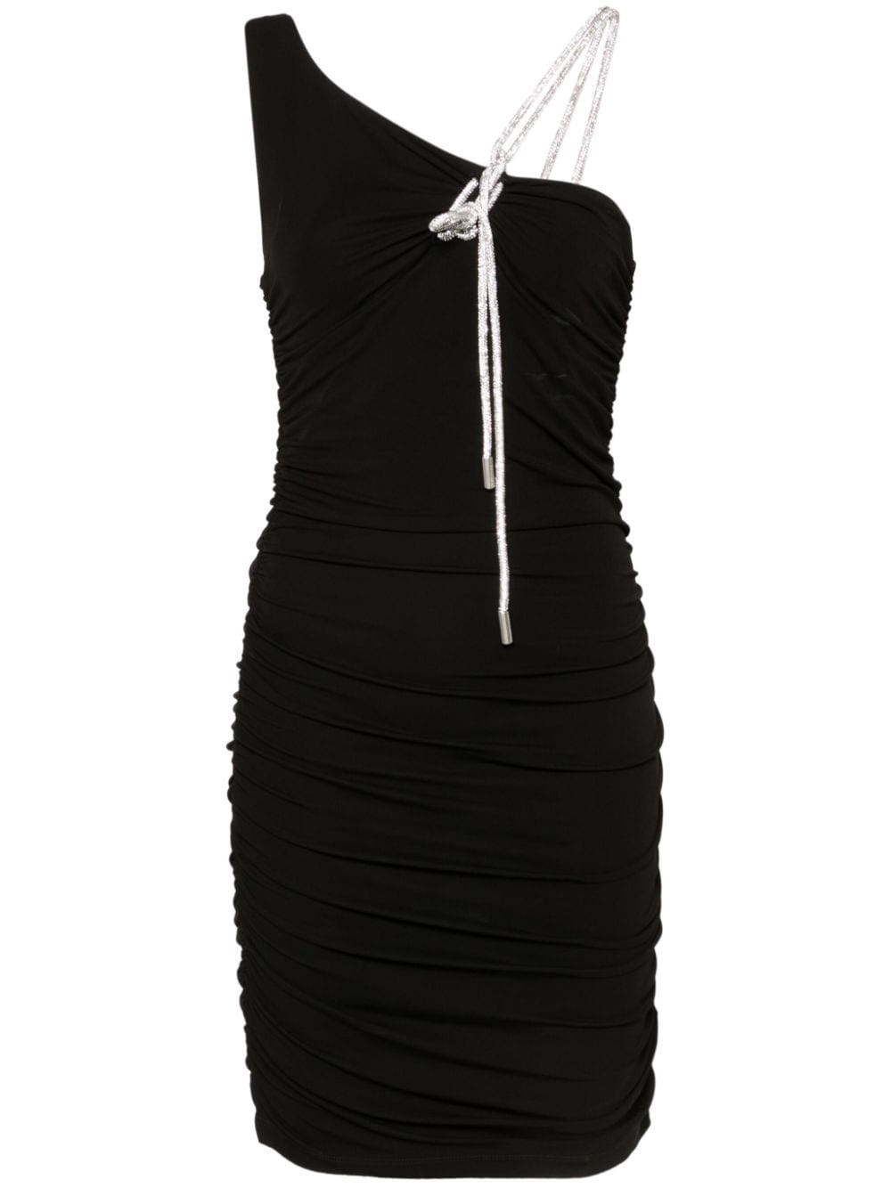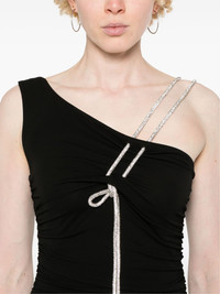 asymmetric crepe mini dress Highlights - Black - Stretch-design - Crepe texture - Asymmetric neck - Sleeveless - Crystal embellished single shoulder strap - Ruched detailing - Draped detailing - Knot detailing - Curved hem - Unlined Made in Italy Composition glass 100%, Viscose 95%, Elastane 5% SIZE & FIT Model measurements Height 5 ft 9 in(1.75 m) Bust/Chest 34.64 in(88 cm) Hips 36.61 in(93 cm) Waist 26.37 in(67 cm) FittingInformation Designed for a close fit throughout Made from a midweight stretch fabric, this piece offers elasticity and flexibility when worn This piece fits true to size – take your usual size