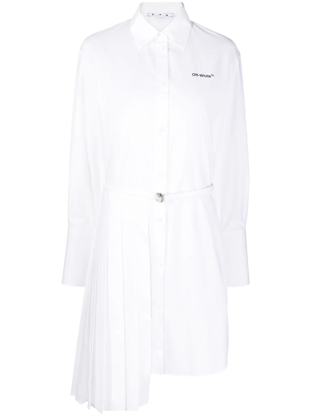 asymmetric pleated shirt dress Off-White reinvents the timeless shirt dress for SS22 with this crisp white cotton iteration, designed for an asymmetric shape and adorned with the brand's signature diagonal stripe print at the rear. With a partially pleated skirt and a belted waist for a defined silhouette, this knee-length piece is finished with a recognizable logo at the chest. Made in Italy Composition Cotton 100% SIZE & FIT Model measurements Height 5 ft 10 in(1.78 m) Bust/Chest 30.31 in(77 cm) Hips 36.61 in(93 cm) Waist 24.8 in(63 cm) FittingInformation This piece fits true to size. We recommend you get your regular size Cut for a loose fit. Comes with an adjustable belt for a flexible fit at the waist Made with a mid-weight non-stretch fabric Washing instructions Dry Clean Only
