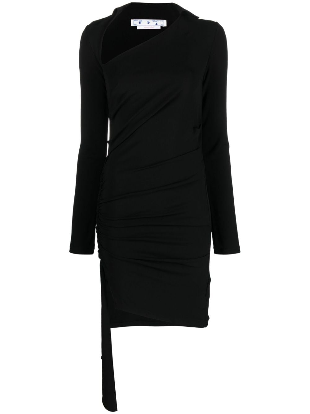 asymmetric ruched minidress This dress from Off-White is rendered in a neutral black palette, drawing attention to the striking ruched construction. Crafted from jersey, it features an asymmetric neckline and elongated draped detailing at the hem. Made in Italy Composition Viscose 95%, Elastane 5% SIZE & FIT Model measurements Height 5 ft 9 in(1.75 m) Bust/Chest 31.88 in(81 cm) Hips 33.85 in(86 cm) Waist 24.01 in(61 cm) Measurement HIPS 31.49 in(80 cm) LENGTH 35.82 in(91 cm) WAIST 28.34 in(72 cm) FittingInformation This piece fits true to size. We recommend you get your regular size Cut for a slim fit Made with a mid-weight stretch fabric