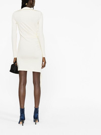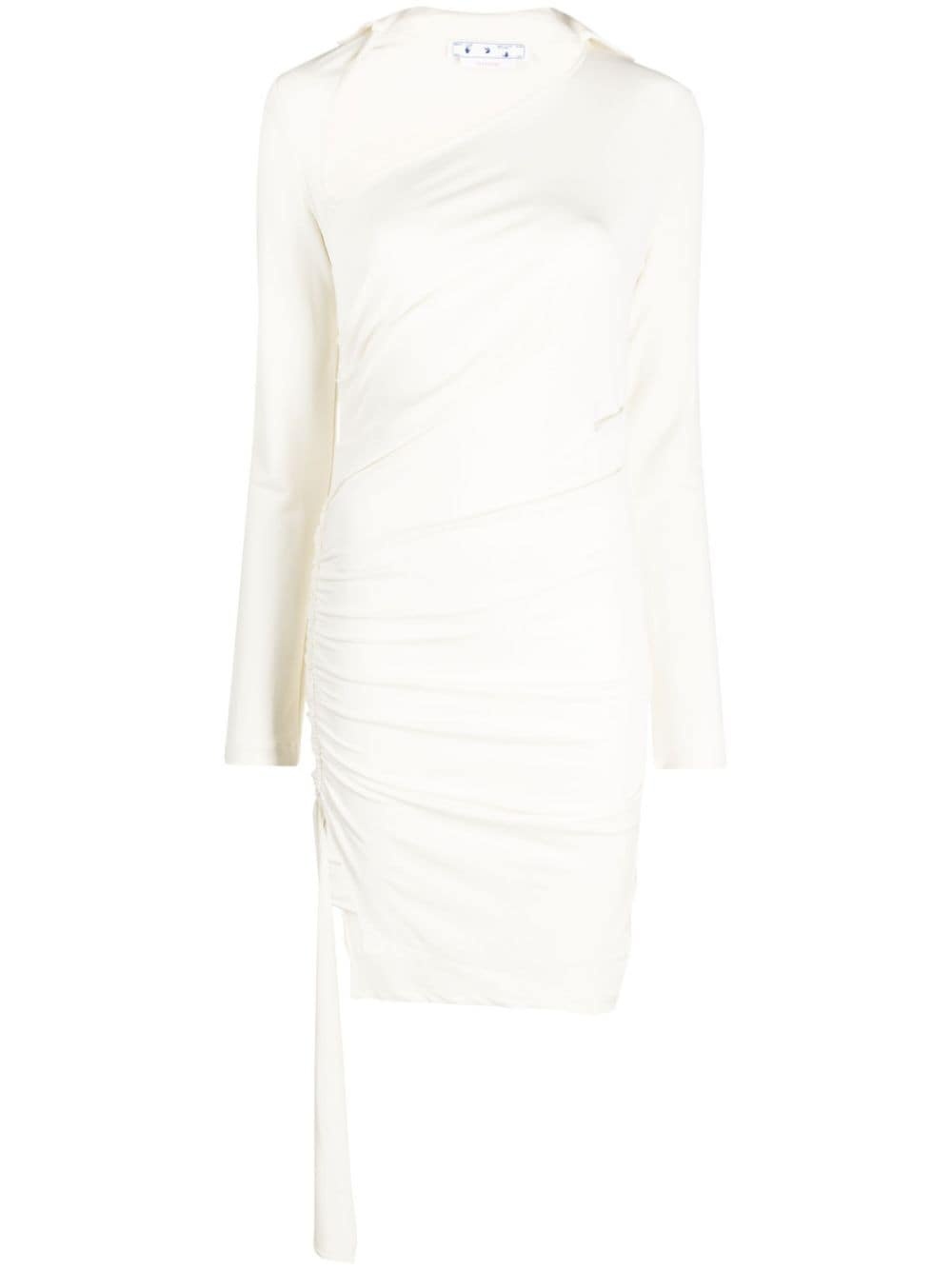 asymmetric ruched minidress This dress from Off-White is rendered in a neutral white palette, drawing attention to the striking ruched construction. Crafted from jersey, it features an asymmetric neckline and elongated draped detailing at the hem. Made in Italy Composition Viscose 95%, Elastane 5% SIZE & FIT Model measurements Height 5 ft 10 in(1.79 m) Bust/Chest 31.1 in(79 cm) Hips 35.03 in(89 cm) Waist 24.01 in(61 cm) FittingInformation This piece fits true to size. We recommend you get your regular size Cut for a slim fit Made with a mid-weight stretch fabric Washing instructions Hand Wash