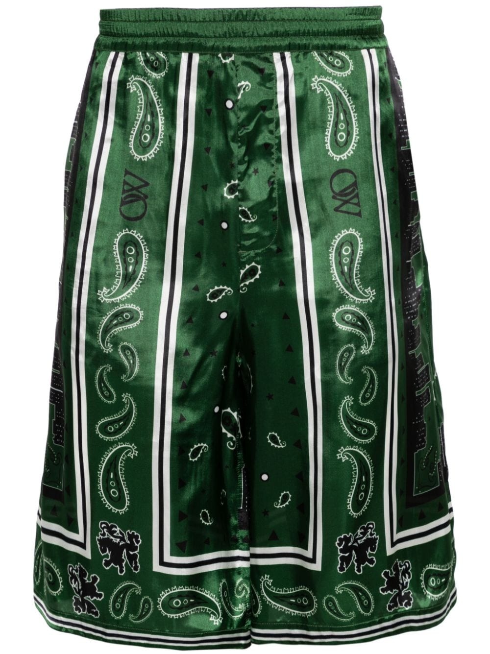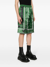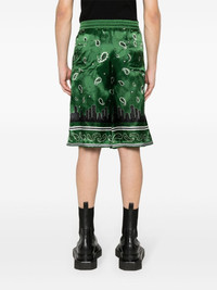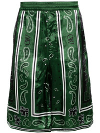 bandana-print twill shorts Highlights - Black/green/white - Twill weave - Semi-sheer construction - All-over logo bandana print - Elasticated waistband - Two side slash pockets - Two rear patch pockets - Internal logo tag - Thigh-length - Internal drawstring fastening waist Made in Italy Composition Lining: FSC Viscose 52%, Cupro 48% Outer: FSC Viscose 100% SIZE & FIT Model measurements Height 6 ft 1 in(1.85 m) Bust/Chest 36.22 in(92 cm) Hips 36.22 in(92 cm) Waist 27.55 in(70 cm) FittingInformation Designed with a wide leg, offering a loose and roomy fit Adjust this piece’s waistband to your preference using the drawstring Made from a lightweight non-stretch fabric This piece fits true to size – take your usual size Washing instructions Dry Clean Only
