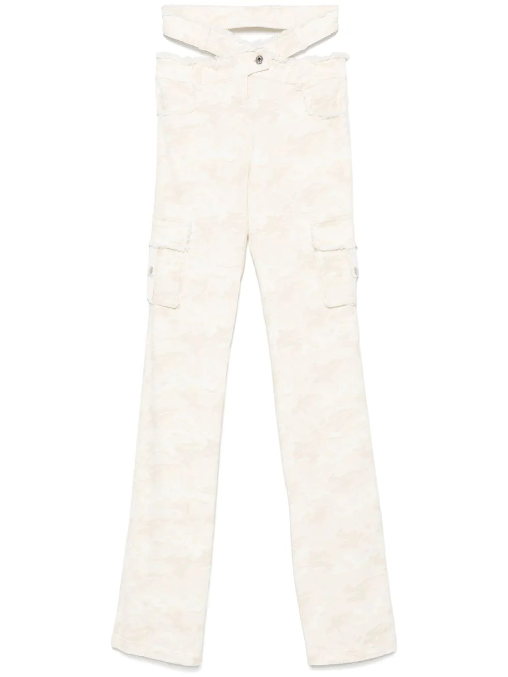belted camouflage-pattern trousers Highlights - Light beige - Concealed fly and button fastening - Classic five pockets - Two side cargo pockets - Frayed edge Made in Italy Composition Outer: Cotton 98%, Elastane 2% Lining: Viscose 100% SIZE & FIT Model measurements Height 5 ft 9 in(1.76 m) Bust/Chest 31.1 in(79 cm) Hips 36.61 in(93 cm) Waist 24.8 in(63 cm) FittingInformation Designed for a slim fit, these trousers offer a close fit at the waist, allowing a comfortable close fit and some movement over the leg Particularly long in length; consider your own measurements Made from a midweight stretch fabric, this piece offers elasticity and flexibility when worn Washing instructions Machine Wash