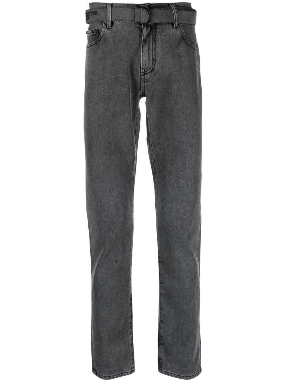 belted straight-leg jeans Boasting the logo print at the waistband, Off-White presents these jeans in a faded black wash for SS23. The belted waist elevates the classic straight-leg cut. Made in Italy Composition Outer: Cotton 100% Lining: Polyester 65%, Cotton 35% SIZE & FIT Model measurements Height 6 ft 0 in(1.84 m) Bust/Chest 36.22 in(92 cm) Hips 35.43 in(90 cm) Waist 26.77 in(68 cm) FittingInformation This piece fits true to size. We recommend you get your regular size Designed for a slim fit at the waist and loose over the leg Made with a mid-weight non-stretch fabric
