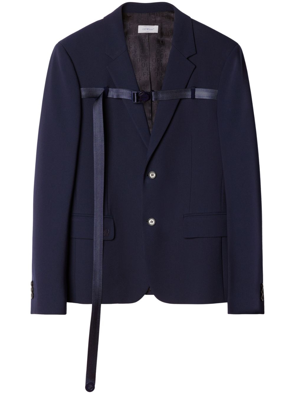 buckled single-breasted blazer This single-breasted blazer is emblematic of Off-White's penchant for imbuing timeless silhouettes with unexpected details. Woven with touches of virgin wool in Italy, it's complete with a tonal buckle at the front, evocative of the label's industrial aesthetic. Highlights - Blue - Virgin wool blend - Peak lapels - Buckle fastening - Long sleeves - Front button fastening - Two front flap pockets - Embroidered logo - Monogram lining - Straight hem Made in Italy Composition Lining: Cotton 100%, Cupro 100%, Viscose 100% Viscose 40%, Polyamide 31%, Virgin Wool 26%, Elastane 3% SIZE & FIT FittingInformation Designed for a slim fit, offering a comfortable fit that sits just away from the body