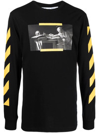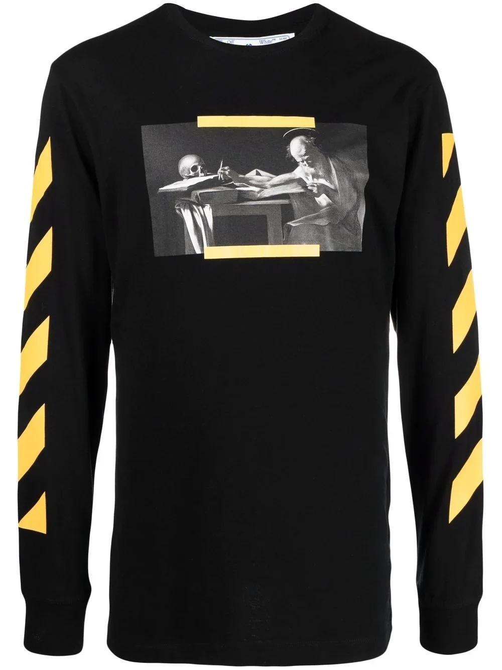 Caravaggio print long-sleeve T-shirt Champions in incorporating streetwear silhouettes with a dash of history, Off-White presents this cotton long-sleeve T-shirt. Detailed with one of the brand's favoured Caravaggio prints, signature Diag-stripe detailing decorates the long sleeves. Imported Composition Cotton 100% SIZE & FIT Model measurements Height 6 ft 2 in(1.89 m) Bust/Chest 35.43 in(90 cm) Hips 36.61 in(93 cm) Waist 28.74 in(73 cm) FittingInformation This piece fits true to size. We recommend you get your regular size Cut for a relaxed fit Made with a mid-weight fabric Washing instructions Machine Wash