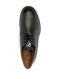 contrasting-sole Derby shoes Already known as Off-White's signature style, the sponge sole appears on these Derby shoes in blue, adding a contrasting detail to the design. The pair is crafted from black leather and features a silver-tone Hands Off logo on the tongue. Made in Italy Composition Outer: Leather 100% Sole: Leather 50%, Rubber 50% Lining: Leather 100% SIZE & FIT Measurement HEEL 1.18 in(3 cm) Sole height 0.59 in(1.5 cm)