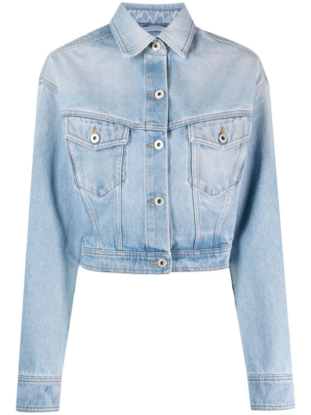 cropped denim jacket Off-White's denim jacket has a boxy silhouette that lends a retro feel. Cropped at the waist, it's washed in a faded light blue hue. Made in Italy Composition Cotton 100% SIZE & FIT Model measurements Height 5 ft 10 in(1.79 m) Bust/Chest 31.49 in(80 cm) Hips 35.03 in(89 cm) Waist 23.62 in(60 cm) Measurement SLEEVE LENGTH 24.01 in(61 cm) LENGTH 20.07 in(51 cm) Washing instructions Machine Wash