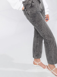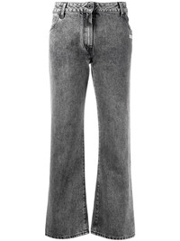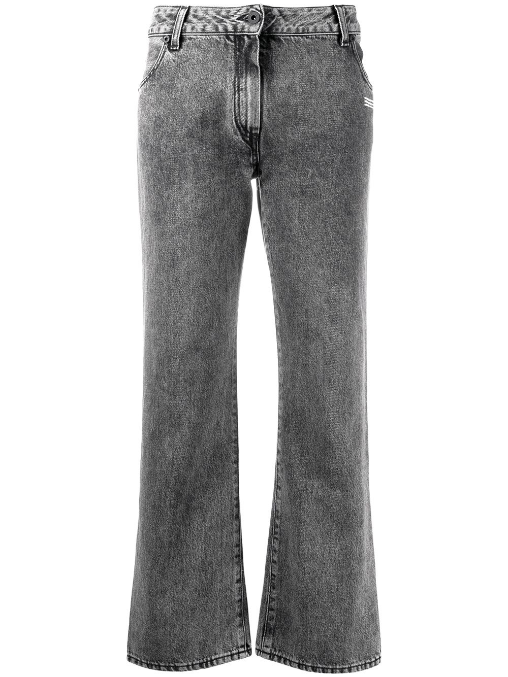 cropped leg mid-rise jeans Demonstrating Off-White's streetwear roots, these acid wash jeans feature a contemporary kick-flare silhouette. A logo stamp to the front adds a branded touch to the casual design. Highlights - Grey - Acid wash - Belt loops - Button fly fastening - Classic five pockets - Cropped leg Made in Italy Composition Outer: Cotton 100% Lining: Polyester 65%, Cotton 35% SIZE & FIT Model measurements Height 5 ft 9 in(1.75 m) Bust/Chest 34.64 in(88 cm) Hips 35.03 in(89 cm) Waist 24.8 in(63 cm) FittingInformation This piece fits true to size. We recommend you get your regular size Designed to be fitted at the waist and through the thigh, loose from the knee Made with a mid-weight non-stretch fabric Washing instructions Machine Wash