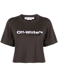 cropped logo-print T-shirt Off-White's T-shirt honours the humble logo tee. This cropped iteration is printed with the brand's logo across the chest in contrasting white letters. Imported Composition Cotton 100%, Polyester 100% Washing instructions Machine Wash