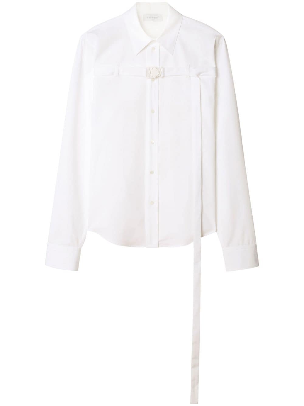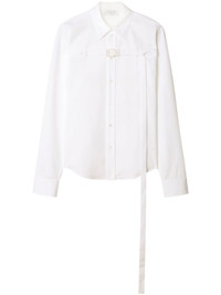buckled cotton-poplin shirt This white shirt is emblematic of Off-White's penchant for imbuing timeless silhouettes with industrial details. It's crafted from white cotton poplin and fitted with a buckled strap that runs from the bust to the cut-out back. Highlights - White - Cotton - Poplin texture - Pointed flat collar - Buckle fastening - Front button fastening - Long sleeves - Buttoned cuffs - Cut-out detailing - Straight hem Made in Italy Composition Cotton 100% SIZE & FIT FittingInformation Designed to be unstructured, offering a loose fit throughout