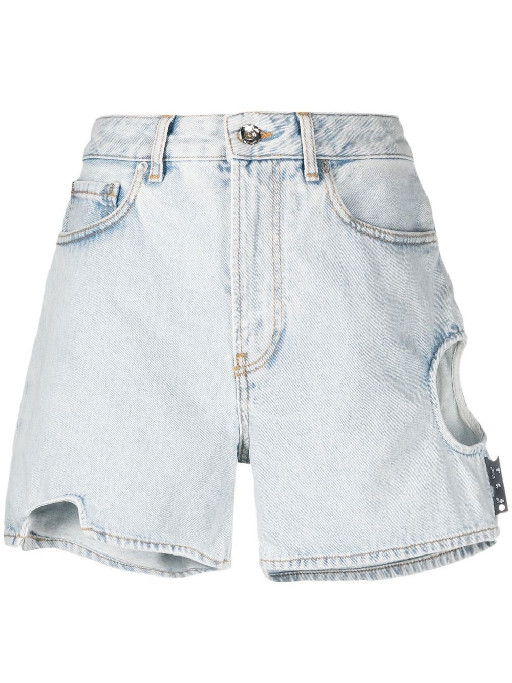 cut-out high-waisted denim shorts Off-White's late founder Virgil Abloh was inspired by meteor craters to design the label's signature cut-out pieces. The influences are clear on these high-waisted shorts, showcasing an affinity for deconstructive designs. Made in Italy Composition Outer: Cotton 100% Lining: Cotton 100% SIZE & FIT Model measurements Height 5 ft 10 in(1.78 m) Bust/Chest 31.49 in(80 cm) Hips 36.22 in(92 cm) Waist 25.59 in(65 cm) FittingInformation This piece fits true to size. We recommend you get your regular size Designed to be fitted at the waist, loose over the leg Made with a mid-weight non-stretch fabric Washing instructions Machine Wash