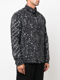 Diag-stripe paint-splatter denim shirt Diag-stripe paint-splatter denim shirt from OFF-WHITE featuring black, cotton, signature Diag-stripe print, paint splatter detail, long sleeves, classic collar, chest patch pocket and front button fastening. Made in Italy Composition Cotton 100%, Acrylic 50%, Wool 50% SIZE & FIT Model measurements Height 6 ft 1 in(1.85 m) Bust/Chest 37.79 in(96 cm) Hips 37.4 in(95 cm) Waist 30.7 in(78 cm) FittingInformation This piece fits true to size. We recommend you get your regular size Cut for a loose fit Made with a mid-weight non-stretch fabric Washing instructions Hand Wash