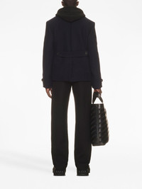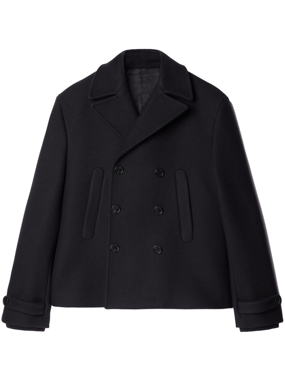 double-breasted peacoat Spun from a plush wool blend in Italy, this Off-White peacoat is an example of the brand's commitment to detail and craftmanship. Presented in a timeless black hue, the double-breasted silhouette is complete with the brand's signature embroidered Arrows motif. Highlights - Black - Wool blend - Notched lapels - Double-breasted button fastening - Long sleeves - Buttoned cuffs - Two side slit pockets - Embroidered motif - Decorative-button waist tabs - Straight hem - Central rear vent Made in Italy Composition Wool 80%, Polyamide 20% Lining: Viscose 100% SIZE & FIT FittingInformation Designed to be unstructured, offering a loose fit throughout The vented hem offers movement at the rear