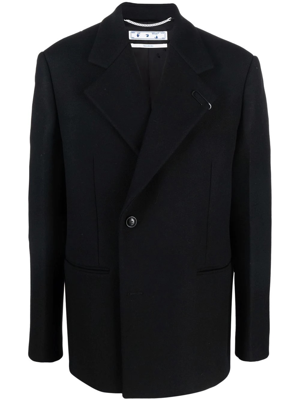 double-breasted short coat OFF-WHITE takes a different approach to its signature industrial streetwear aesthetic with this double-breasted short coat. Crafted from a recycled wool blend, this refined piece is subtly elevated by a single paperclip at the lapel. Highlights - Black - Recycled-wool blend - Signature paperclip detail - Notched lapels - Double-breasted button fastening - Long sleeves - Two front welt pockets Made in Italy Composition Outer: Recycled Wool 78%, Polyamide 19%, other fibers 3% Lining: Viscose 52%, Cupro 48% SIZE & FIT Model measurements Height 6 ft 1 in(1.86 m) Bust/Chest 36.61 in(93 cm) Hips 36.61 in(93 cm) Waist 29.92 in(76 cm) FittingInformation This piece fits true to size. We recommend you get your regular size Cut for a loose fit Made with a mid-weight non-stretch fabric