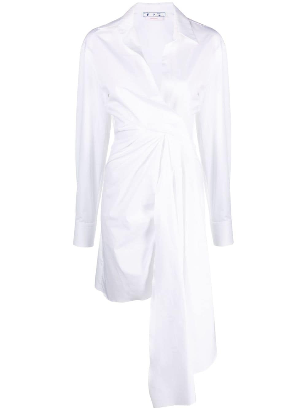 draped asymmetric cotton-poplin shirt dress Off-White's eye for innovative fashion means simple shirt dresses like these become eye-catchers. This rendition is cut from crisp cotton-poplin in an asymmetric silhouette with a gathered waist and draped panel that extends past the knee. Highlights - White - Cotton - Cutaway collar - Draped detailing - Long sleeves - Asymmetric hem Made in Italy Composition Cotton 100%, Polyester 100% SIZE & FIT Model measurements Height 5 ft 10 in(1.77 m) Bust/Chest 32.67 in(83 cm) Hips 35.43 in(90 cm) Waist 23.62 in(60 cm) FittingInformation Designed for a slim fit that sits just away from the body offering a close yet comfortable fit Made from a midweight non-stretch fabric This piece fits true to size – take your usual size Washing instructions Machine Wash