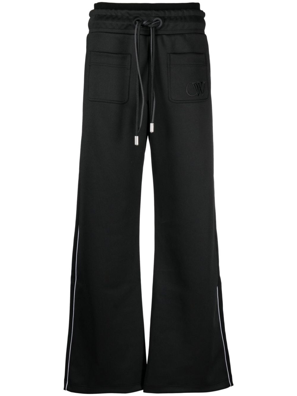 elasticated-waist cotton track pants Off-White channels its casual style with these track pants. Cut from cotton to a relaxed wide-leg silhouette, they're fitted with an adjustable waistband and finished with tonal logo embroidery. Highlights - Black - Cotton - Contrasting trim - Elasticated drawstring waistband - Embroidered logo to the front - Two front patch pockets - Rear welt pocket Made in Italy Composition Outer: Polyester 94%, Elastane 6% Lining: Cotton 100% SIZE & FIT Model measurements Height 5 ft 9 in(1.76 m) Bust/Chest 31.88 in(81 cm) Hips 35.43 in(90 cm) Waist 24.8 in(63 cm) FittingInformation Designed with a wide-leg cut, these trousers allow for a close fit at the waist and offer a loose and roomy fit over the leg Adjust this piece’s waistband to your preference using the drawstring Made from a midweight stretch fabric, this piece offers elasticity and flexibility when worn This piece fits true to size – take your usual size