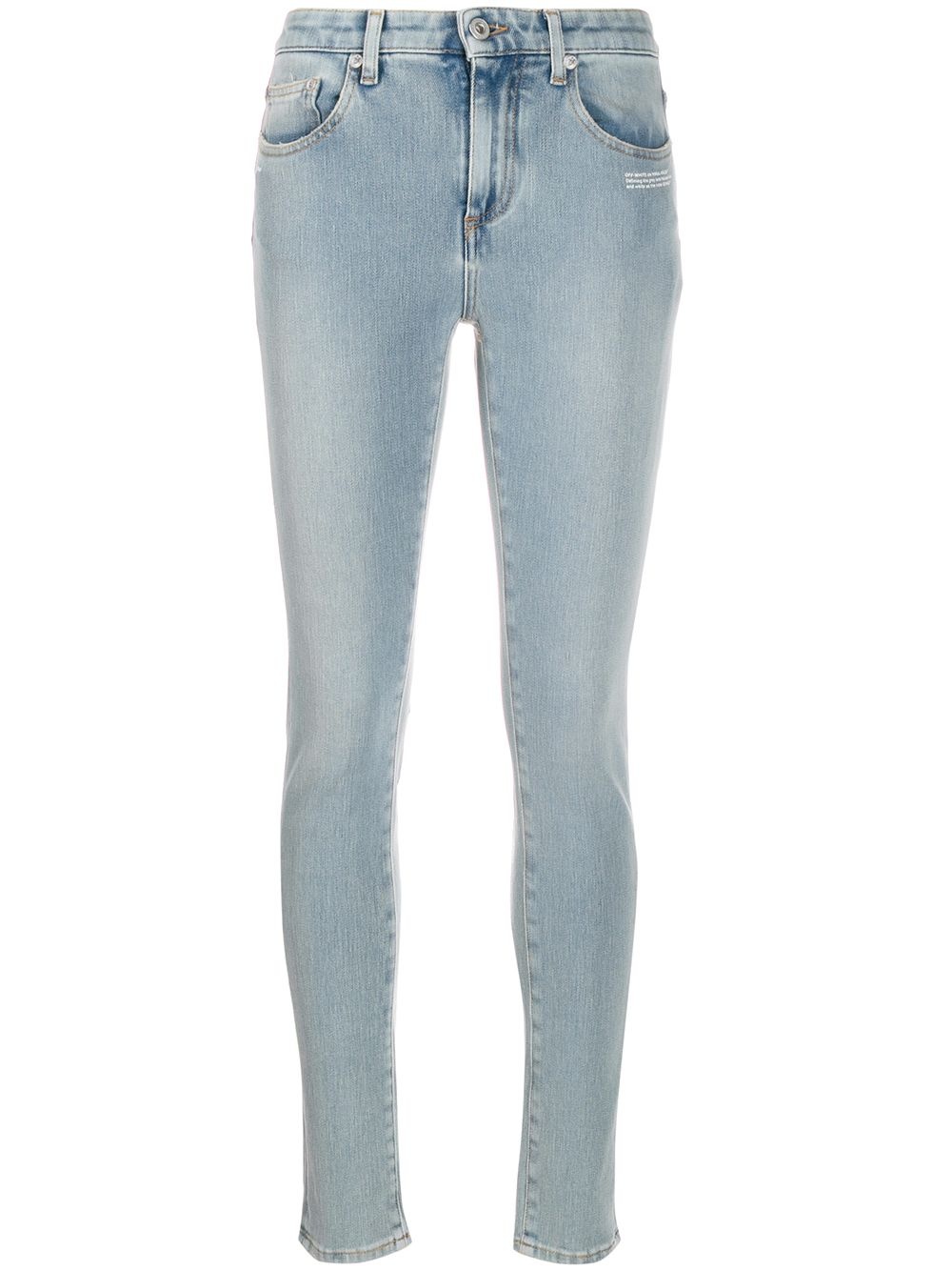 embroidered details skinny jeans Off-White adds its own spin on a classic silhouette. These light blue cotton blend skinny jeans present embroidered details at the back, finished with fringed accents. Perfect for a distinctive style. Featuring a mid rise, belt loops, a button and zip fly, a five pocket design, rivet detailing, a printed logo to the front, a branded rear patch, embroidered details and a skinny fit. Made in Italy Composition Outer: Cotton 100% Lining: Cotton 100% SIZE & FIT Model measurements Height 5 ft 11 in(1.8 m) Bust/Chest 33.07 in(84 cm) Hips 37.4 in(95 cm) Waist 25.19 in(64 cm) FittingInformation This piece fits true to size. We recommend you get your regular size Cut for a slim fit Made with a mid-weight fabric Washing instructions Hand Wash