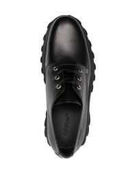 Exploration leather Derby shoes Off-White imbues a classic design with utilitarian character in these black Derby shoes. Cut from smooth calf leather to a sleek almond-toe silhouette, they are set atop a chunky rubber heel and platform sole embossed with the brand's Diag Stripe motif, lending a rugged yet unmistakable quality. Highlights - Black - Calf leather - Smooth grain - Signature diag-stripe print - Debossed logo to the side - Almond toe - Front lace-up fastening - Block heel - Branded leather insole - Platform sole Made in Italy Composition Lining: Calf Leather 100% Sole: Rubber 100% Outer: Calf Leather 100% SIZE & FIT Measurement HEEL 2.75 in(7 cm) Sole height 1.96 in(5 cm)