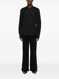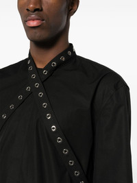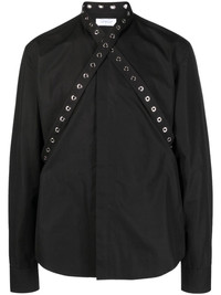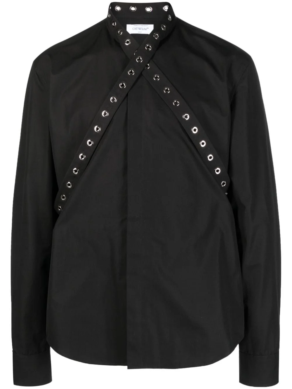 eyelet-embellished cotton shirt Off-White gives a signature creative treatment to the classic shirt. Cut from cotton, it boasts a classic collar that extends into two crossover straps with eyelets, which envelop the chest for a harness-like effect. Highlights - Black - Cotton - Eyelet embellishment - Concealed front button fastening - Long sleeves - Buttoned cuffs - Curved hem Made in Italy Composition Cotton 100%, Brass 100% SIZE & FIT Model measurements Height 6 ft 0 in(1.84 m) Bust/Chest 36.22 in(92 cm) Hips 35.43 in(90 cm) Waist 26.77 in(68 cm) FittingInformation Designed to be unstructured, offering a loose fit throughout Made from a midweight non-stretch fabric This piece fits true to size – take your usual size Washing instructions Machine Wash