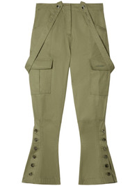 flared cargo pants Highlights - Military green - Organic cotton - Twill weave - Embroidered logo to the side - Strap detailing - High-rise - Concealed front zip fastening - Side button fastening - Flared - Two front pouch pockets - Two side cargo pockets - Two rear flap pockets Made in Italy Composition Organic Cotton 100%