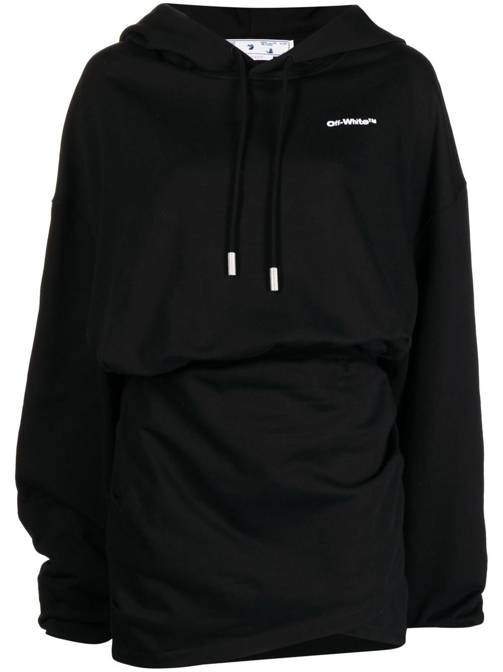 For All hooded dress With a relaxed silhouette and draped skirt, this black hooded sweatshirt dress from Off-White is crafted from soft cotton. Featuring a drawstring hood, the piece is simply punctuated by the brand's embroidered logo at the chest in contrasting white. Made in Italy Composition Cotton 100% SIZE & FIT Model measurements Height 5 ft 10 in(1.77 m) Bust/Chest 31.49 in(80 cm) Hips 35.43 in(90 cm) Waist 25.19 in(64 cm) Measurement HIPS 34.64 in(88 cm) LENGTH 34.25 in(87 cm) WAIST 27.55 in(70 cm) FittingInformation This piece fits true to size. We recommend you get your regular size Designed for a loose fit at the bust and waist with a close fit on the hips Made with a mid-weight fabric Washing instructions Machine Wash
