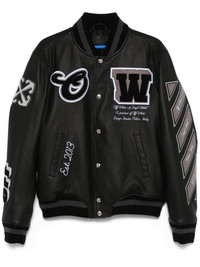 Full Leather bomber jacket Highlights - Black - Front press-stud fastening - Two side welt pockets - Logo patch at the chest - Signature arrows motif Imported Composition Lining: Cotton 100%, Polyester 100%, Viscose 52%, Cupro 48% Outer: Leather 100%, Wool 90%, Polyamide 5%, Elastane 5% SIZE & FIT Model measurements Height 6 ft 0 in(1.84 m) Bust/Chest 35.82 in(91 cm) Hips 37 in(94 cm) Waist 28.34 in(72 cm) FittingInformation Designed for a relaxed fit, this piece allows for comfort and movement when worn The ribbed hem offers a close, comfortable fit Made from a midweight non-stretch fabric