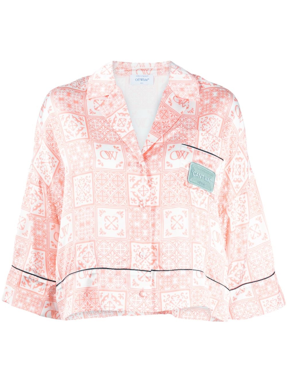 graphic-print satin shirt Inspired by traditional tiles, the graphic print that adorns this shirt integrates Off-White's distinctive Arrows motif. The silhouette is made from lustrous satin and features a contrasting logo applique on the chest. Highlights - Rose pink/white/black - All-over graphic print - Signature arrows motif - Applique logo - Torchon piping detail - Camp collar - Front button fastening - Three-quarter length sleeves - Straight hem - Cropped Made in Italy Composition Viscose 100% SIZE & FIT Model measurements Height 5 ft 10 in(1.77 m) Bust/Chest 31.49 in(80 cm) Hips 35.43 in(90 cm) Waist 25.19 in(64 cm) FittingInformation Designed to be unstructured, offering a loose fit throughout Made from a lightweight non-stretch fabric This piece fits true to size – take your usual size Washing instructions Dry Clean Only