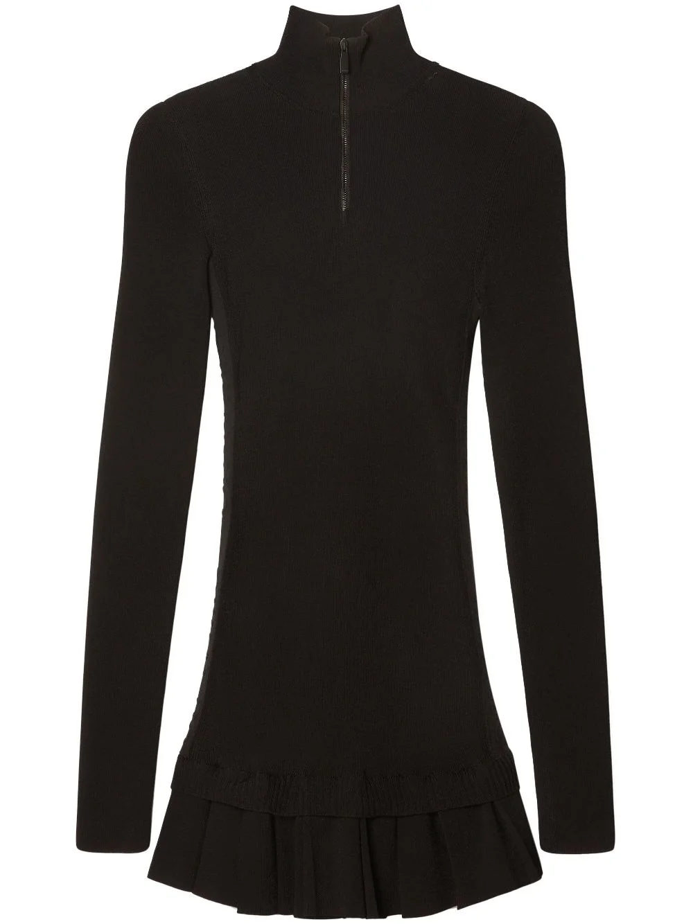 high-neck pleated knitted minidress Presented in black, this minidress by Off-White boasts a fine-knit construction that opens to a narrow pleated skirt. Designed for a fitted silhouette, it features a high-neck and comes with a short front zip. Highlights - Black - Knitted construction - High neck - Short front zip fastening - Long sleeves - Pleated skirt - Straight hem Made in Italy Composition Viscose 80%, Polyamide 20%