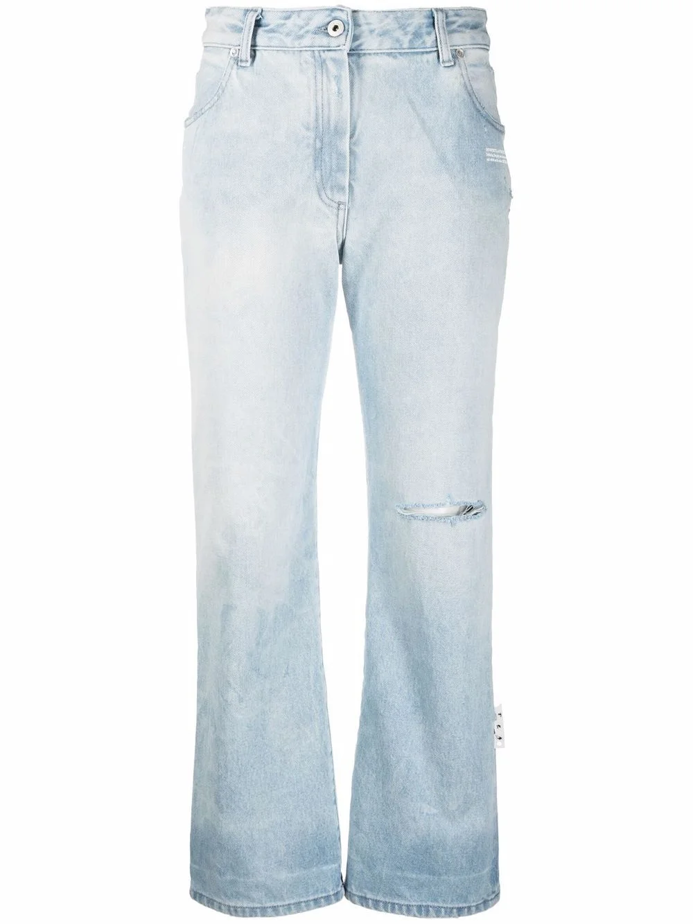 high-rise distressed straight-leg jeans Off-White's jeans offer a masterclass in refined casualwear. Equally comfortable and sleek, this high-rise pair is distressed throughout for a lived-in look. Made in Italy Composition Lining: Cotton 100% Outer: Cotton 100% Washing instructions Machine Wash
