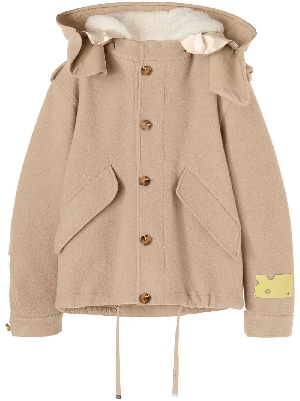 hooded short parka coat camel brown virgin wool blend classic hood front button fastening two diagonal pockets to the sides long sleeves Made in Italy Composition Virgin Wool 75%, Polyamide 25%