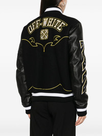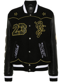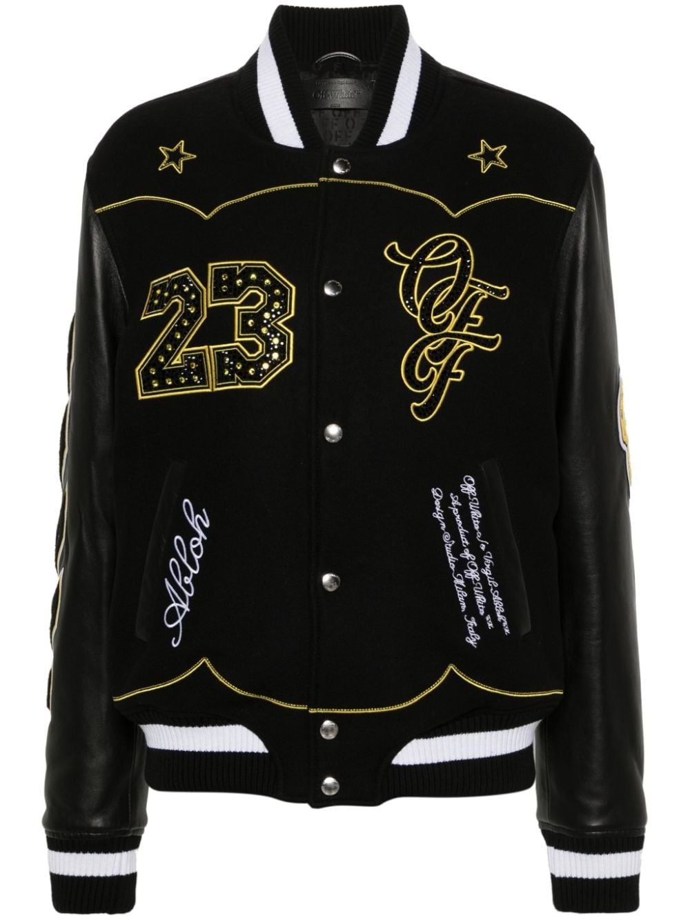 Horseshoe bomber jacket Highlights - Black - Virgin wool/leather - Brushed effect - Panelled design - All-over logo patches - Signature arrows motif - Diagonal stripe pattern - Embroided detailing - Rhinestone embellishment - Bead embellishment - Contrast stitching - Stripe trim - Baseball collar - Front press-stud fastening - Long sleeves - Two side welt pockets - Ribbed cuffs and hem - Logo-jacquard lining Imported Composition Outer: Leather 100%, Virgin Wool 75%, Polyamide 25% Lining: Viscose 100%, Cotton 100%, Polyester 100% SIZE & FIT Model measurements Height 5 ft 11 in(1.8 m) Bust/Chest 33.07 in(84 cm) Hips 37.4 in(95 cm) Waist 25.19 in(64 cm) FittingInformation Designed for a relaxed fit, this piece allows for comfort and movement when worn The ribbed hem offers a close, comfortable fit Made from a midweight non-stretch fabric This piece fits true to size – take your usual size Washing instructions Specialist Cleaning
