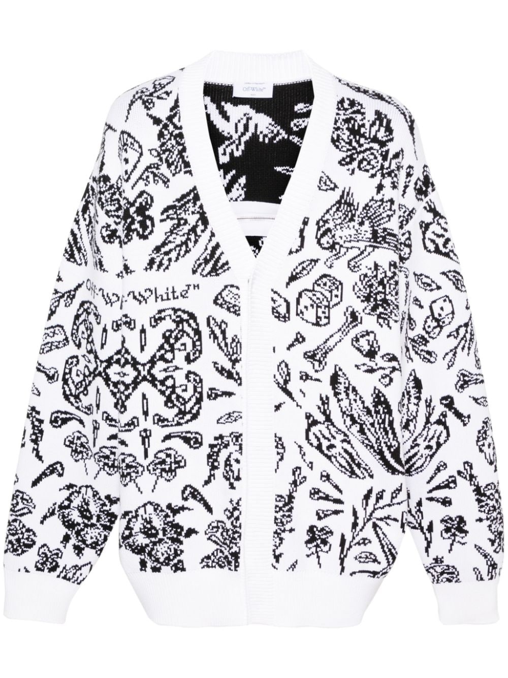 intarsia-knit V-neck cardi-coat Highlights - White/black - Cotton blend - Knitted construction - Patterned intarsia knit - Intarsia-knit logo - Ribbed trim - V-neck - Concealed front press-stud fastening - Drop shoulder - Concealed rear zip opening - Long sleeves - Ribbed cuffs and hem Made in Italy Composition Cotton 73%, Polyamide 26%, Elastane 1% SIZE & FIT Model measurements Height 6 ft 2 in(1.89 m) Bust/Chest 37.79 in(96 cm) Hips 37 in(94 cm) Waist 29.92 in(76 cm) FittingInformation Designed for an oversized fit, offering additional room throughout Made with a midweight knit, this piece offers some stretch This piece fits true to size – take your usual size Washing instructions Dry Clean Only