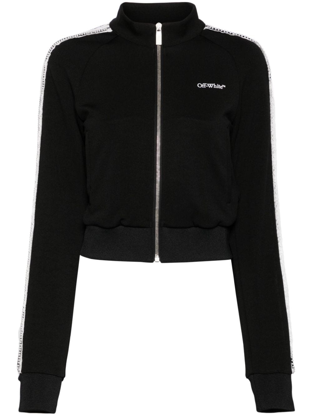lace logo-print track jacket Highlights - Black - Lace detailing - Logo print at the chest - Front zip fastening - Stand-up collar - Two side slash pockets - Long sleeves - Ribbed cuffs and hem Made in Italy Composition Outer: Polyamide 56%, Viscose 44% Lining: Cotton 100% SIZE & FIT Model measurements Height 5 ft 10 in(1.77 m) Bust/Chest 27.95 in(71 cm) Hips 34.64 in(88 cm) Waist 22.83 in(58 cm) FittingInformation Designed for a boxy fit, intended for a loose fit throughout The ribbed hem offers a close, comfortable fit Made from a midweight non-stretch fabric, this piece offers minimal elasticity when worn Washing instructions Hand Wash