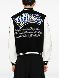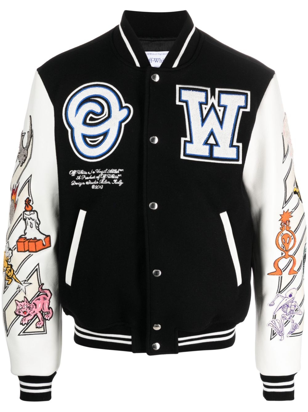 Logic Patch varsity jacket Off-White's Logic collection pays homage to Virgil Abloh and the label's future projects by reinventing heritage designs. Spun from a virgin wool blend, this varsity jacket is decorated with embroidered patches on its contrasting sleeves, while the script logo decorates the back. Highlights - Black/multicolour - Virgin wool blend - Patchwork design - Stripe detailing - Stand-up collar - Front button fastening - Long sleeves - Two side slit pockets - When buying this unisex item, keep in mind that it is graded in standard men's sizing Made in Italy Composition Lining: Viscose 100%, Polyester 100% Trims: Polyester 50%, Cotton 20%, Acrylic 15%, Wool 15% Outer: Virgin Wool 75%, Polyamide 25% SIZE & FIT Model measurements Height 5 ft 10 in(1.77 m) Bust/Chest 34.64 in(88 cm) Hips 35.43 in(90 cm) Waist 24.8 in(63 cm) FittingInformation This unisex piece is designed for a loose fit whether you usually select women's or men's sizes The ribbed hem offers a close, comfortable fit Made from a midweight non-stretch fabric