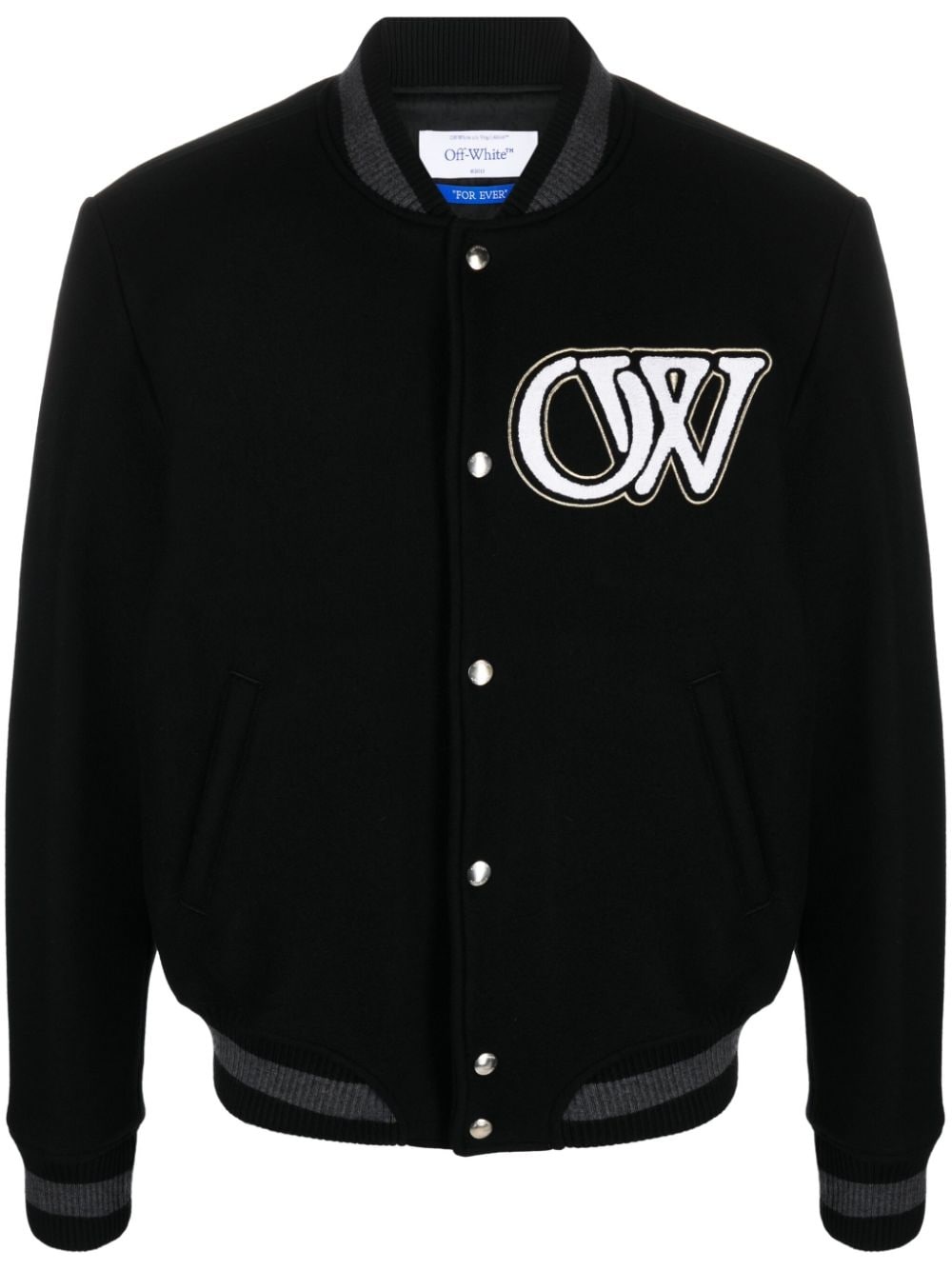 logo-applique varsity bomber jacket Off-White's jacket is an ode to preppy varsity bomber styles. Spun from virgin wool, it features a traditional stand collar and ribbed trims that define the slouchy silhouette. The applique and embroidered detailing lend a branded finish. Highlights - Black/light grey - Virgin wool blend - Applique detailing - Embroidered logo to the rear - Ribbed edge - Stand-up collar - Long sleeves - Press-stud fastening Made in Italy Composition Outer: Virgin Wool 75%, Polyamide 25% Lining: Viscose 100% SIZE & FIT Model measurements Height 6 ft 2 in(1.88 m) Bust/Chest 36.61 in(93 cm) Hips 35.82 in(91 cm) Waist 27.95 in(71 cm) Measurement CHEST 47.24 in(120 cm) SLEEVE LENGTH 27.55 in(70 cm) LENGTH 25.19 in(64 cm) FittingInformation Designed for a relaxed fit, this piece allows for comfort and movement when worn The ribbed hem offers a close, comfortable fit Made from a midweight non-stretch fabric This piece fits true to size – take your usual size Washing instructions Dry Clean Only